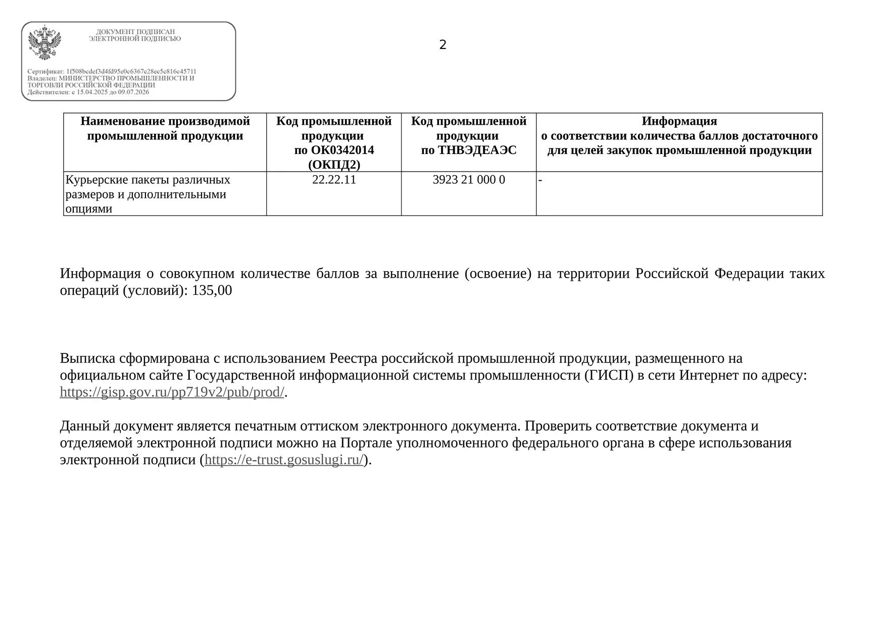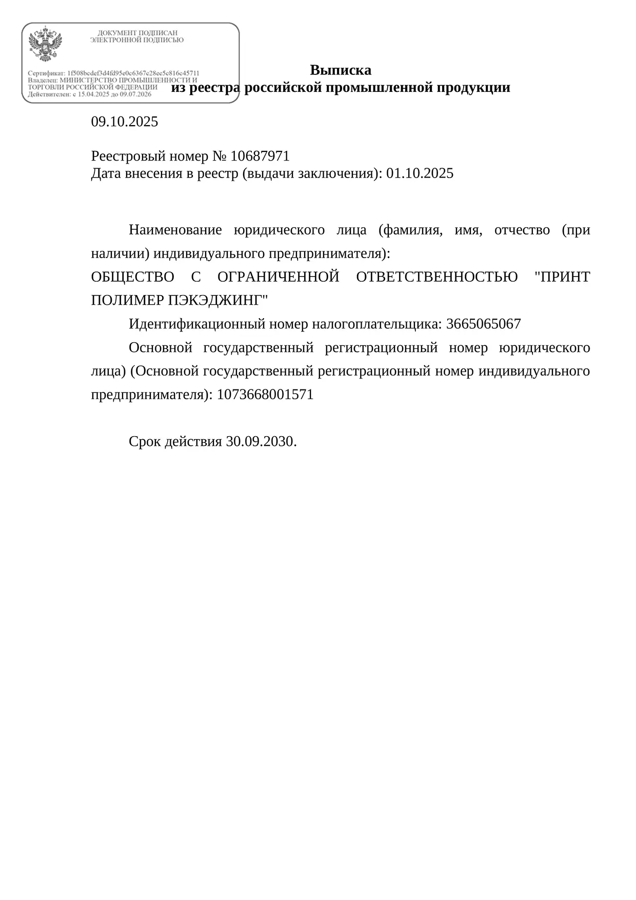 1 октября 2025 года пакеты «КУРЬЕР» производства Принт Полимер Пэкэджинг внесли в реестр российской промышленной продукции, размещённый на сайте Государственной информационной системы промышленности (ГИСП).